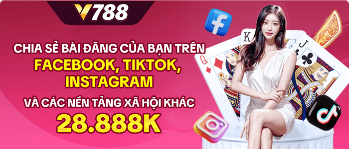 Chỉ vài thao tác đơn giản ai cũng có thể nhận được số tiền 28,888K tại v788vn Com khi chỉ cần chia sẻ trang chủ nhà cái trên các nền tảng mạng xã hội như Tik Tok, Facebook, Telegram,…người chơi sẽ nhận được số tiền lớn trải nghiệm.